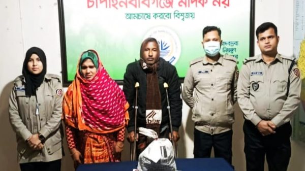নাচোল থানাধীন ডিএনসির অভিযানে ১ কেজি গাঁজাসহ স্বামী-স্ত্রী আটক মাহিদুল ইসলাম ফরহাদ চাঁপাইনবাবগঞ্জ জেলা প্রতিনিধি চাঁপাইনবাবগঞ্জের নাচোল উপজেলায় মাদকদ্রব্য নিয়ন্ত্রণ অধিদপ্তরের অভিযানে স্বামী-স্ত্রীসহ দুইজনকে আটক করা হয়েছে। এসময় তাদের কাছ