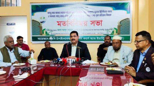 দি চাঁপাইনবাবগঞ্জ চেম্বার অব কমার্স এন্ড ইন্ডাস্ট্রি আয়োজনে রমজান উপলক্ষে মতবিনিময় সভা মাহিদুল ইসলাম ফরহাদ চাঁপাইনবাবগঞ্জ জেলা প্রতিনিধি আসন্ন মাহে রমজান মাসের পবিত্রতা রক্ষা, নিত্যপ্রয়োজনীয় ভোগ্যপণ্যের মূল্য স্থিতিশীল রাখা, বাজারে