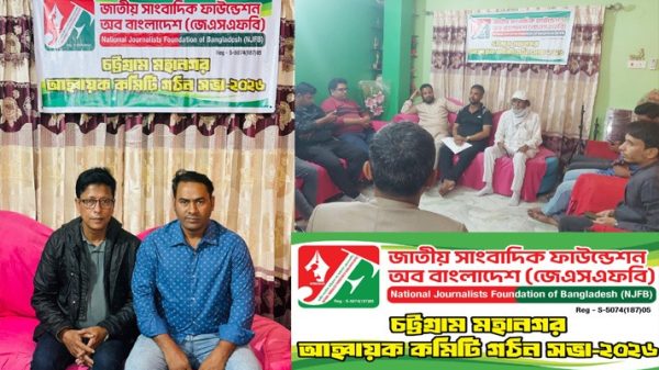 জাতীয় সাংবাদিক ফাউন্ডেশন অফ বাংলাদেশ (জেএসএফবি) চট্টগ্রাম মহানগর আহবায়ক কমিটি গঠন জামাল উদ্দীন, কক্সবাজার জেলা প্রতিনিধি জাতীয় সাংবাদিক ফাউন্ডেশন অব বাংলাদেশ চট্টগ্রাম মহানগর আহবায়ক কমিটি গঠন করা হয়েছে। ৩০ জানুয়ারি