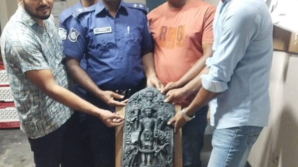 দিনাজপুর বোজাগঞ্জ কালচে রঙের মূর্তি উদ্ধার দিনাজপুর জেলা প্রতিনিধি আরুন চন্দ্র শীল বোচাগঞ্জ থানা পুলিশ কর্তৃক অভিযান পরিচালনা। করিয়া ২ নং ইশানিয়া ইউনিয়নের ডাঙ্গিপাড়া গ্রামে। বালা খুড়ি পুকুর হইতে একটি